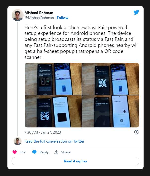 据 Mishaai 透露,未来支持 Fast Pair 的 Android 手机可快速发现正处于初始设置阶段的同类设备。
