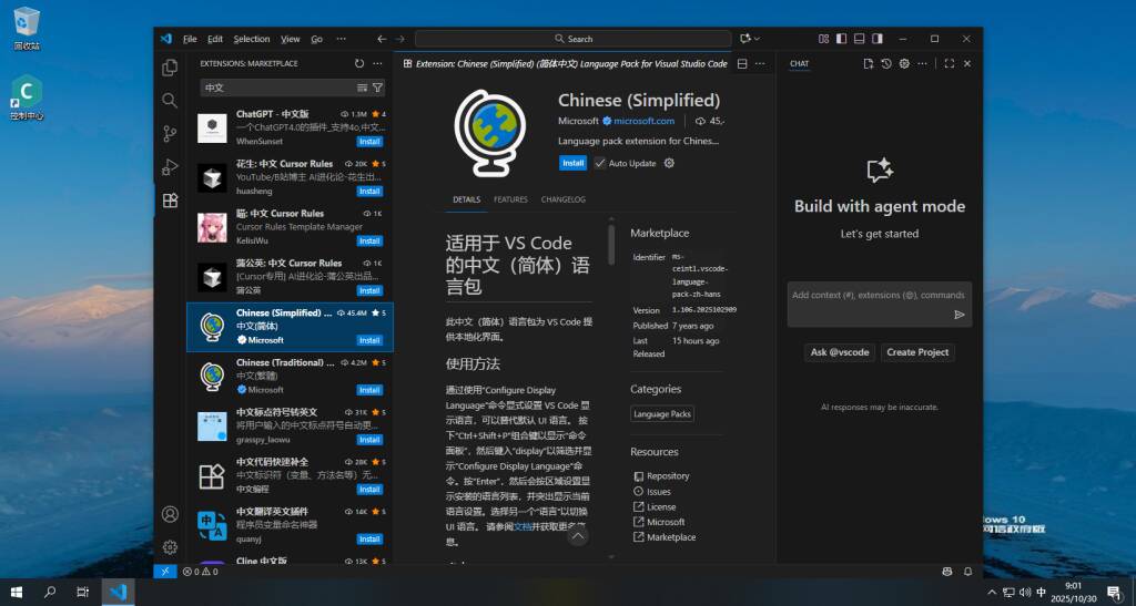 默认英文,搜索并安装 Chinese (Simplified) Language Pack 后右下角点击 Restart 即可。